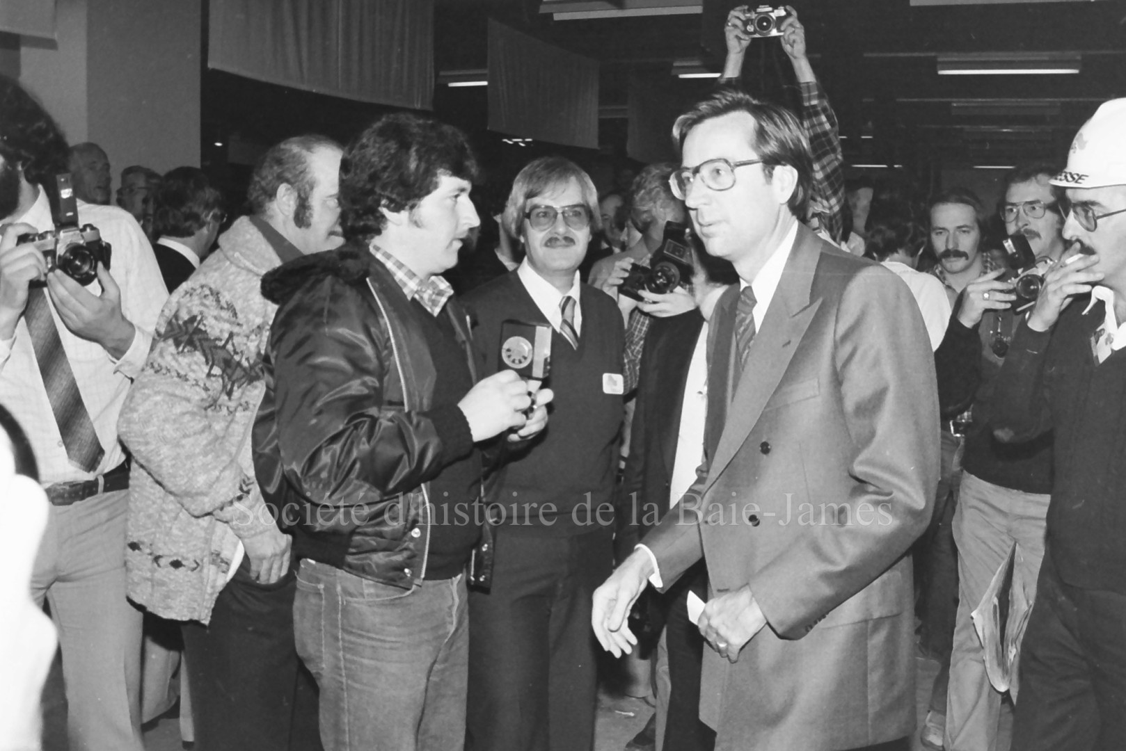 Le député François Gendron discute avec des travailleurs, lors de la visite du complexe LG-2. Inauguration officielle du complexe LG-2, 27 octobre 1979. Ronald Brisson | P146,S1,D5