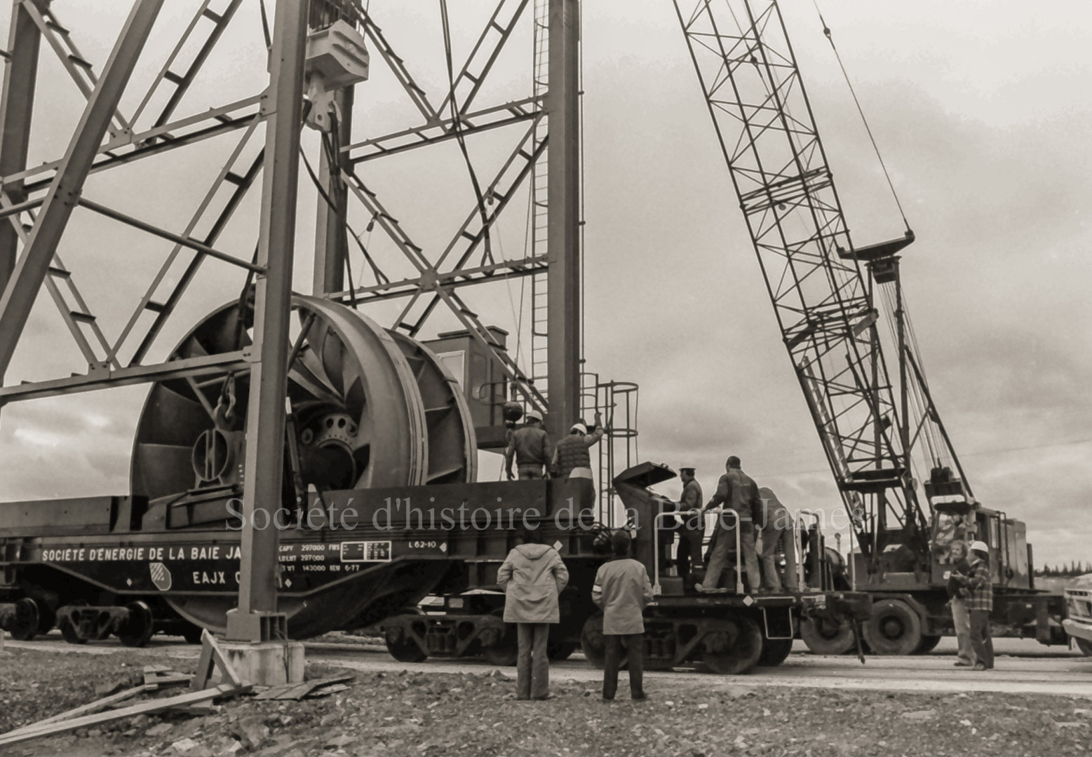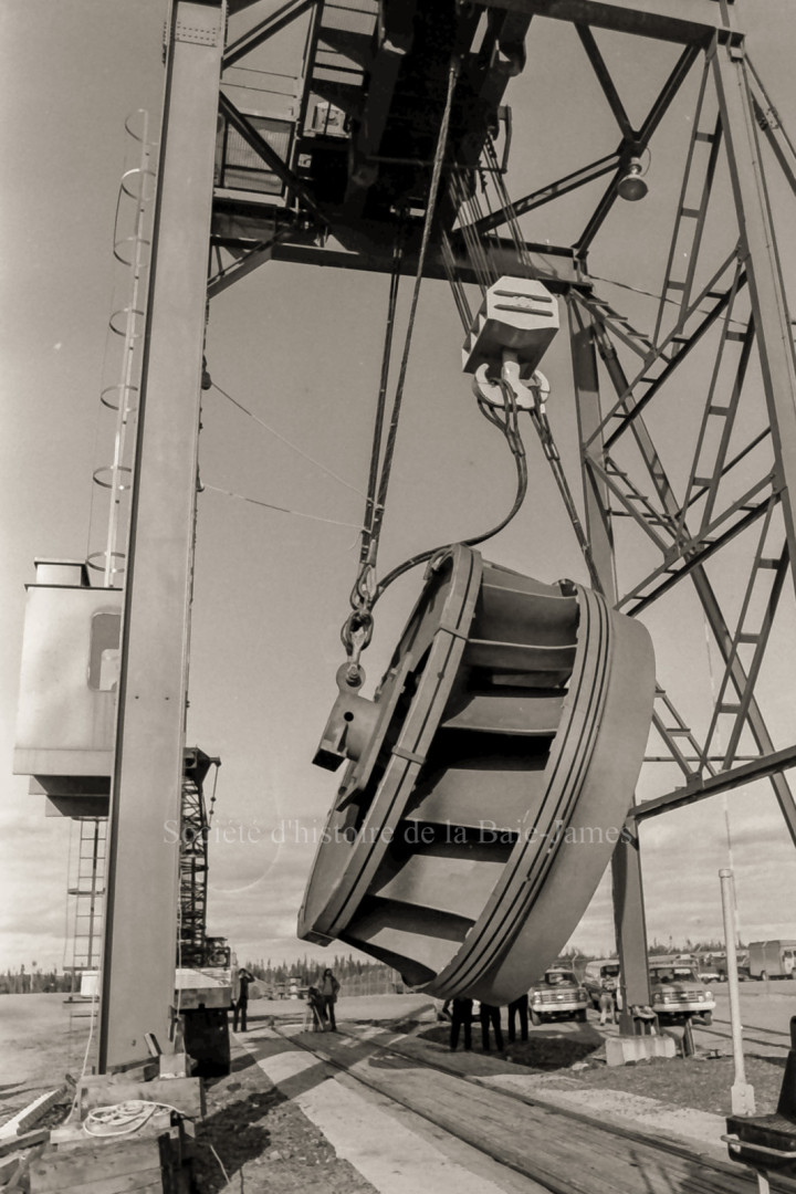 Chargement d'une turbine à Matagami, destinée aux chantiers hydroélectriques de la Baie-James, [Entre 1978 et 1983]. Ronald Brisson | P146,S1,D1