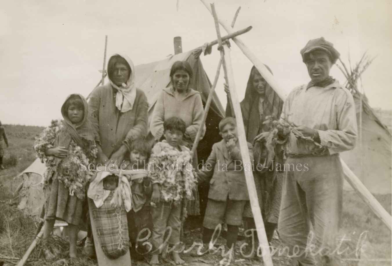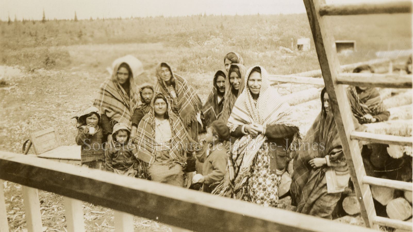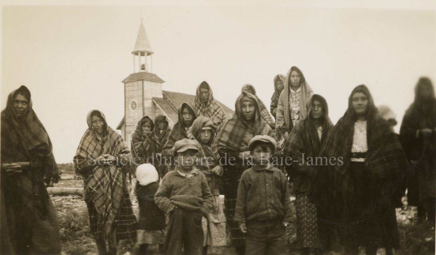Groupe de femmes et d’enfants cris devant l’église de Fort Albany, [1939?]. P195,S1,D1,P30.