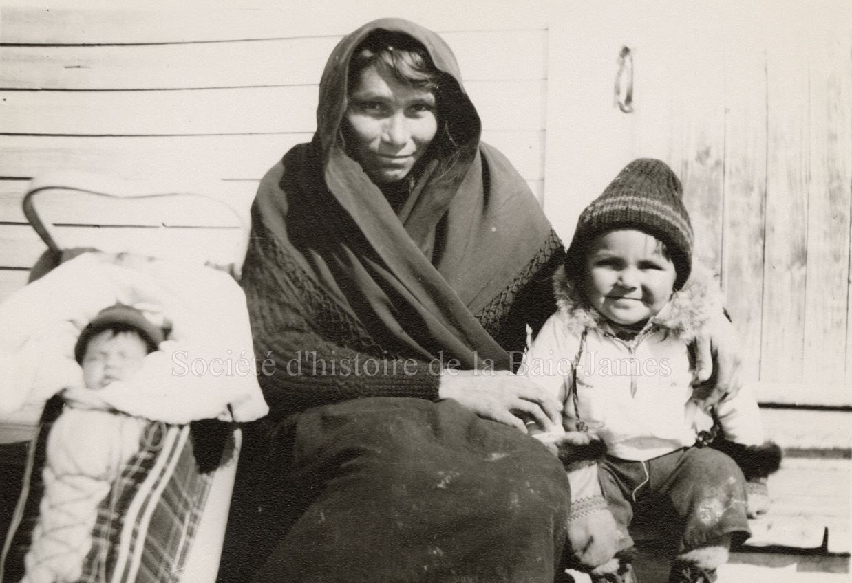 Une mère Crie et ses deux enfants, probablement à la mission catholique de Fort Albany, dans les années 1930. P195,S1,D1,P21.
