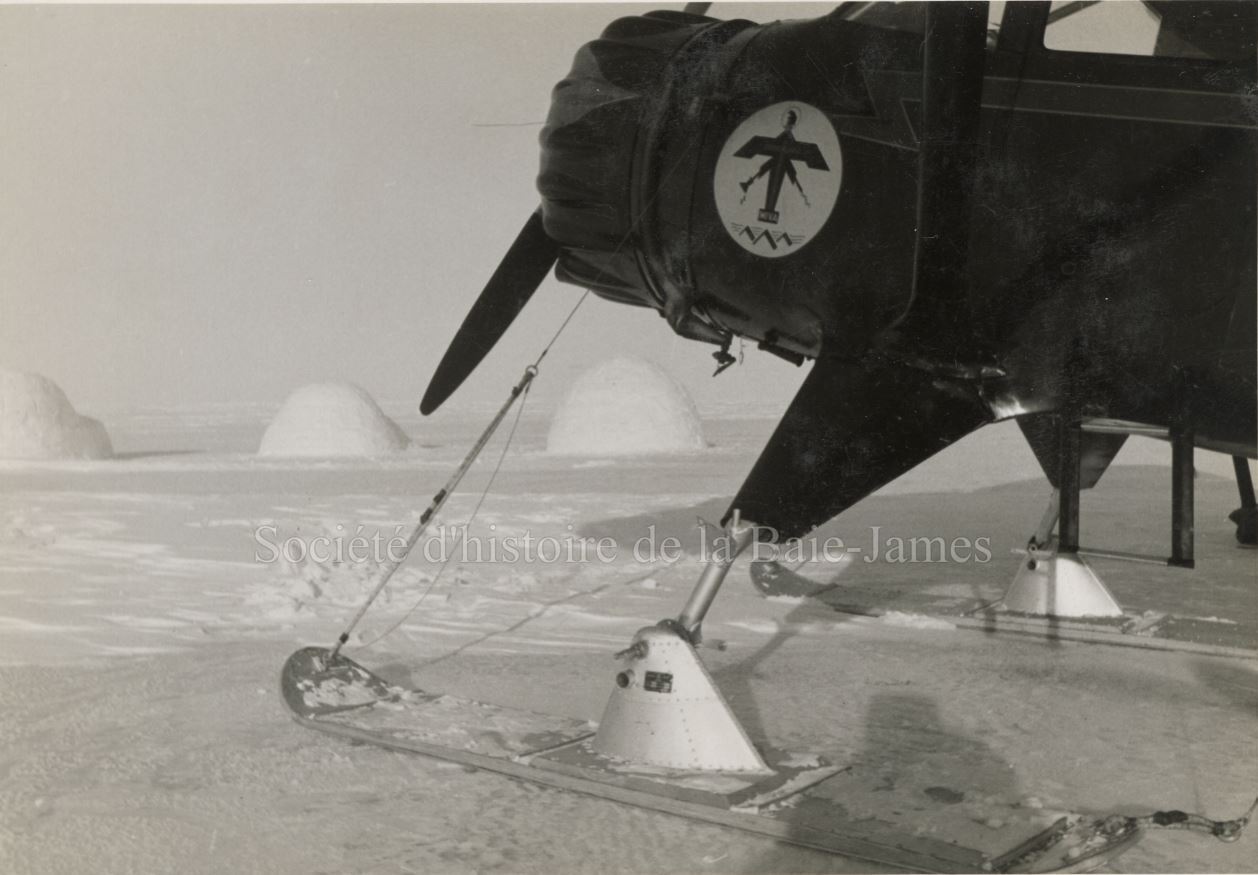 Avion St. Lucas de la MIVA, sur skis, devant trois igloos. [1936 ou 1937]. Photo probablement prise lors du tournage du film La croix survolant les glaces polaires, du père Paul Schulte O.M.I., prêtre aviateur allemand, fondateur