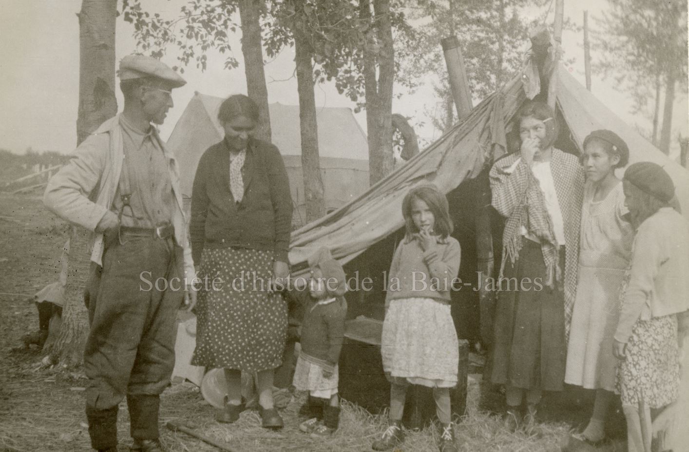 Familles cries devant une tente, probablement à la mission catholique de Fort Albany, dans les années 1930. P195,S1,D1,P18.