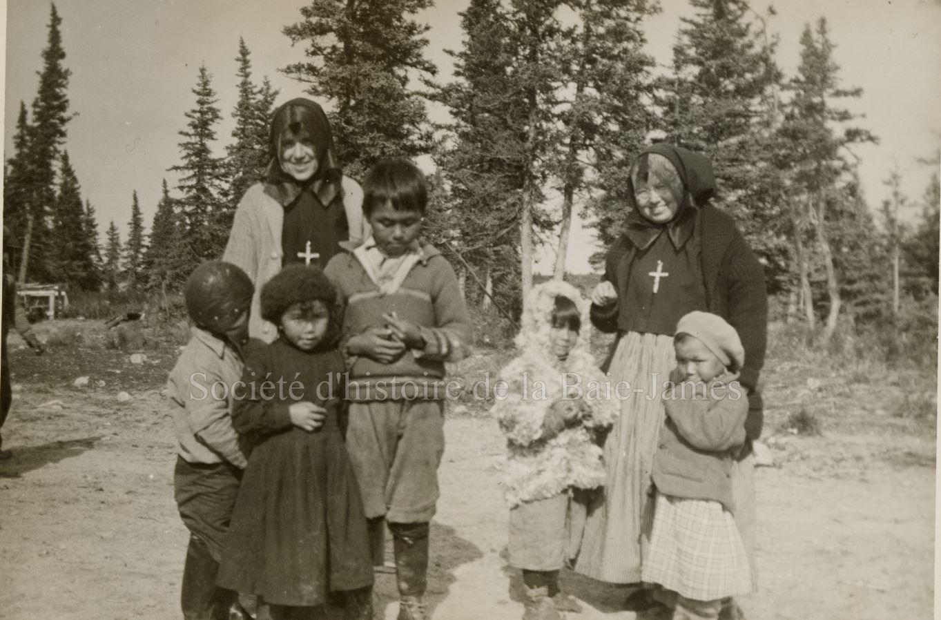 Deux religieuses en compagnie d’enfants cris, années 1930. P195,S1,D1,P23.