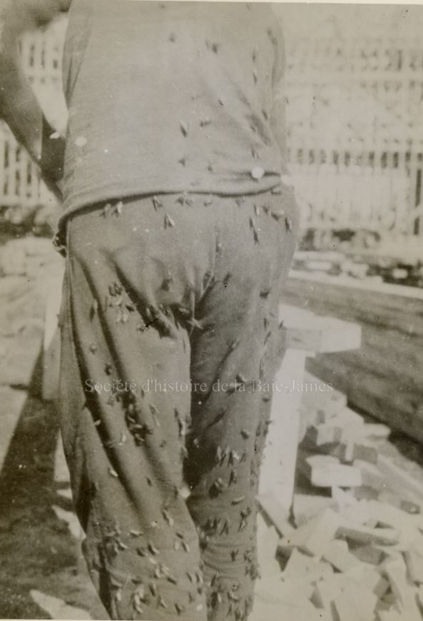 Homme sciant du bois et recouvert de taons, à la mission catholique de Fort Albany, dans les années 1930. P195,S1,D1,P12.