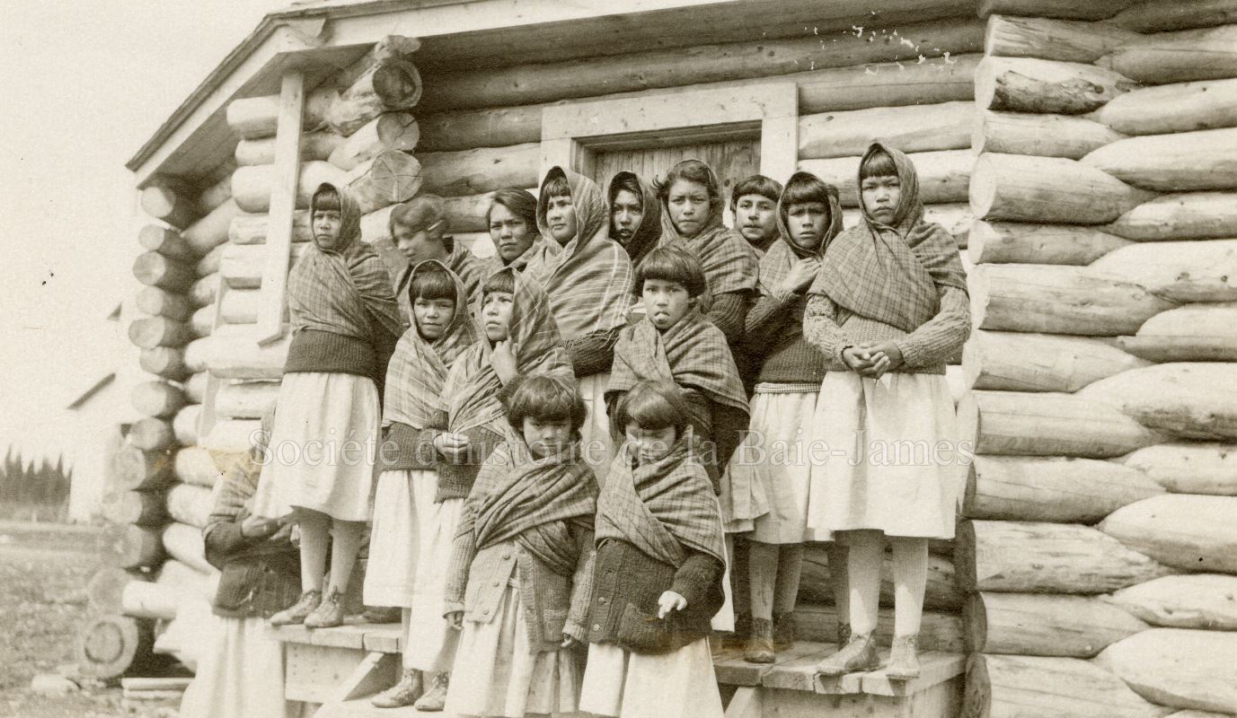 Groupe de femmes et d'enfants cris, probablement à la mission catholique de Fort Albany, dans les années 1930. P195,S1,D1,P26.