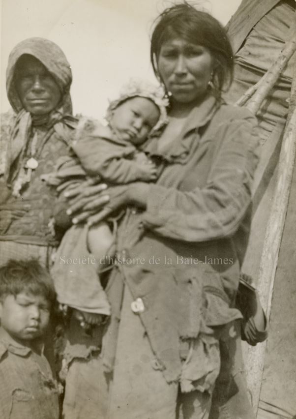 Deux femmes et deux enfants cris, probablement à la mission catholique de Fort Albany, dans les années 1930. P195,S1,D1,P14.