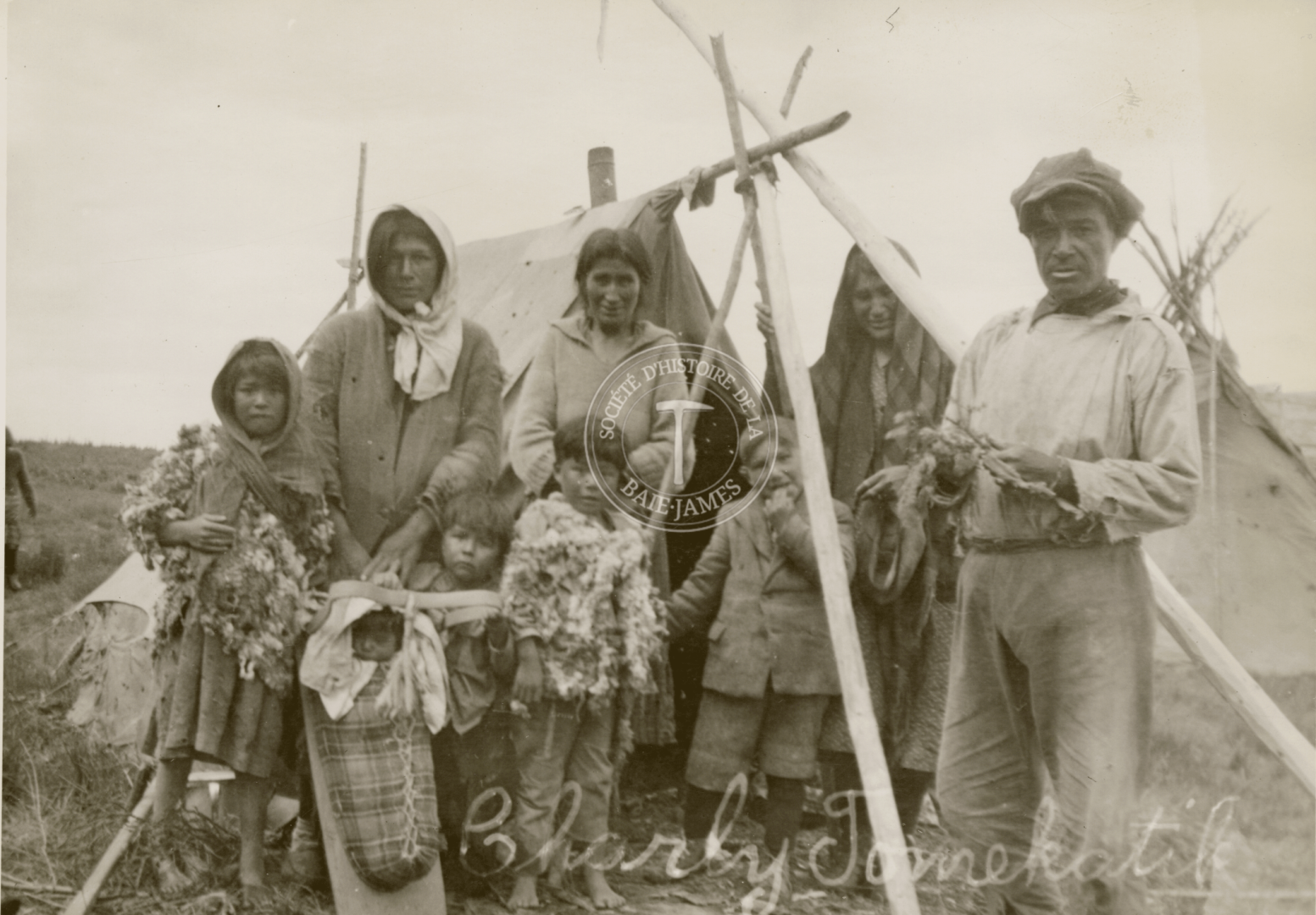 Famille crie devant une tente, probablement à la mission catholique de Fort Albany, dans les années 1930. P195,S1,D1,P28.
